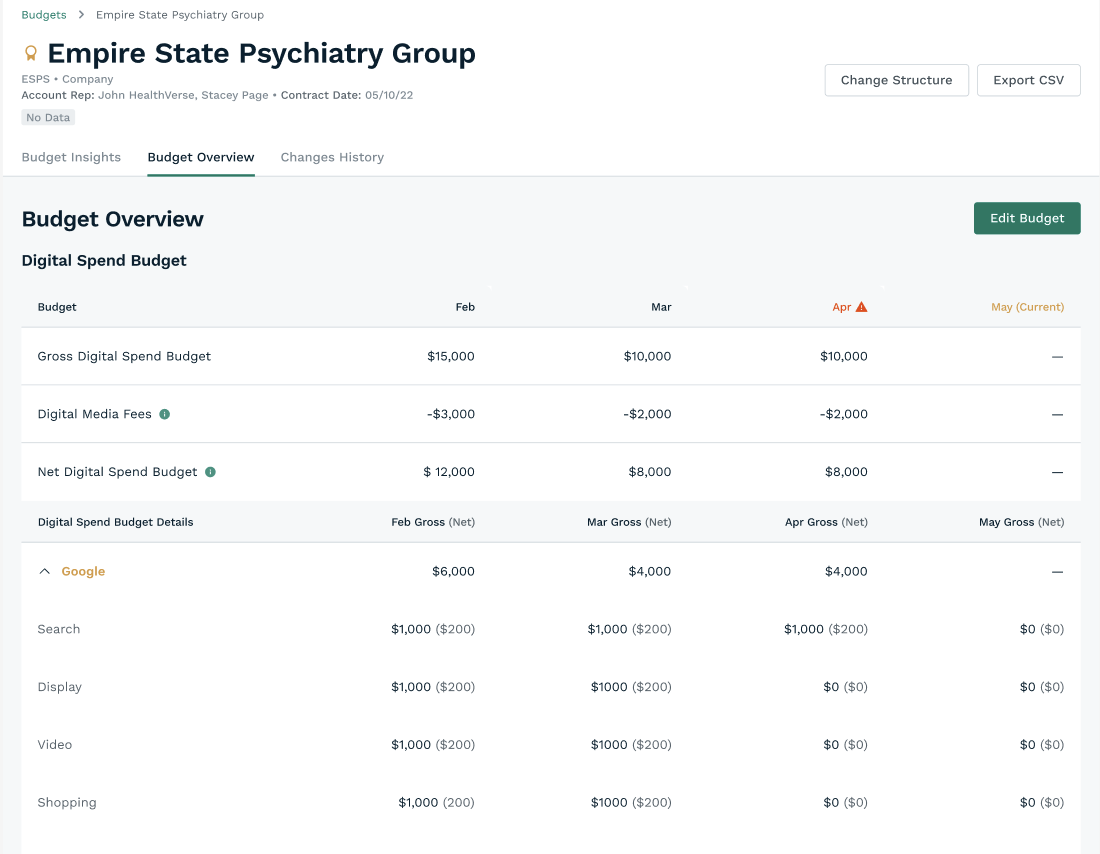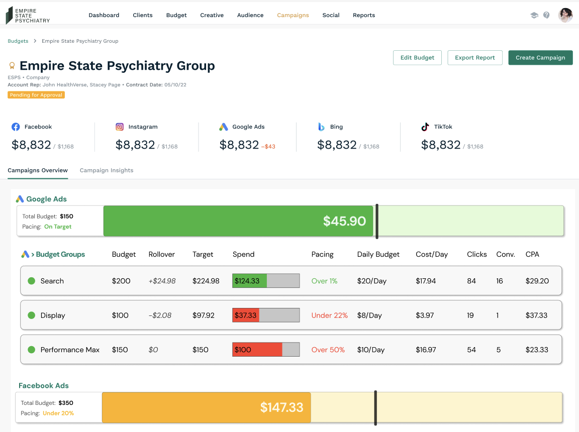 Plan and manage your marketing budget with precision using HealthVerse’s intuitive financial planning tools. Submit campaigns for approval, allocate spend across Google, Meta, directories, and other key channels, and track performance historically—all from one centralized dashboard.